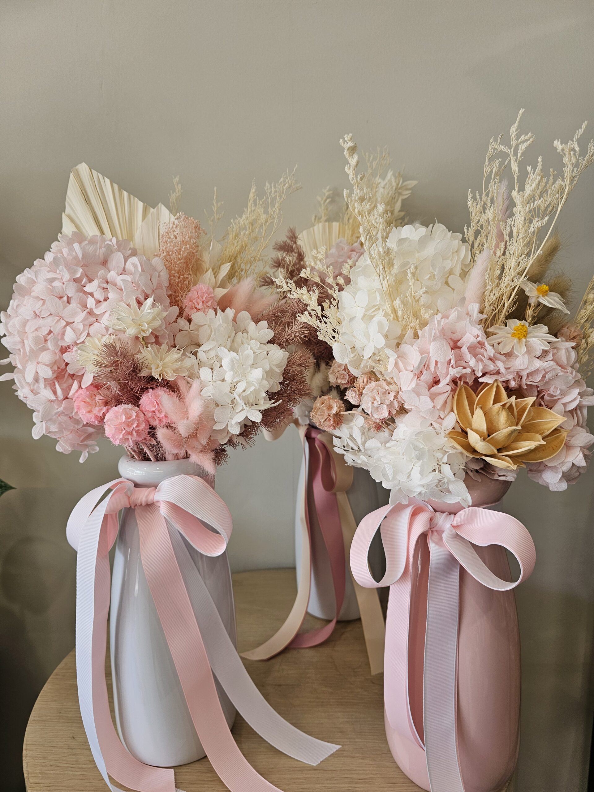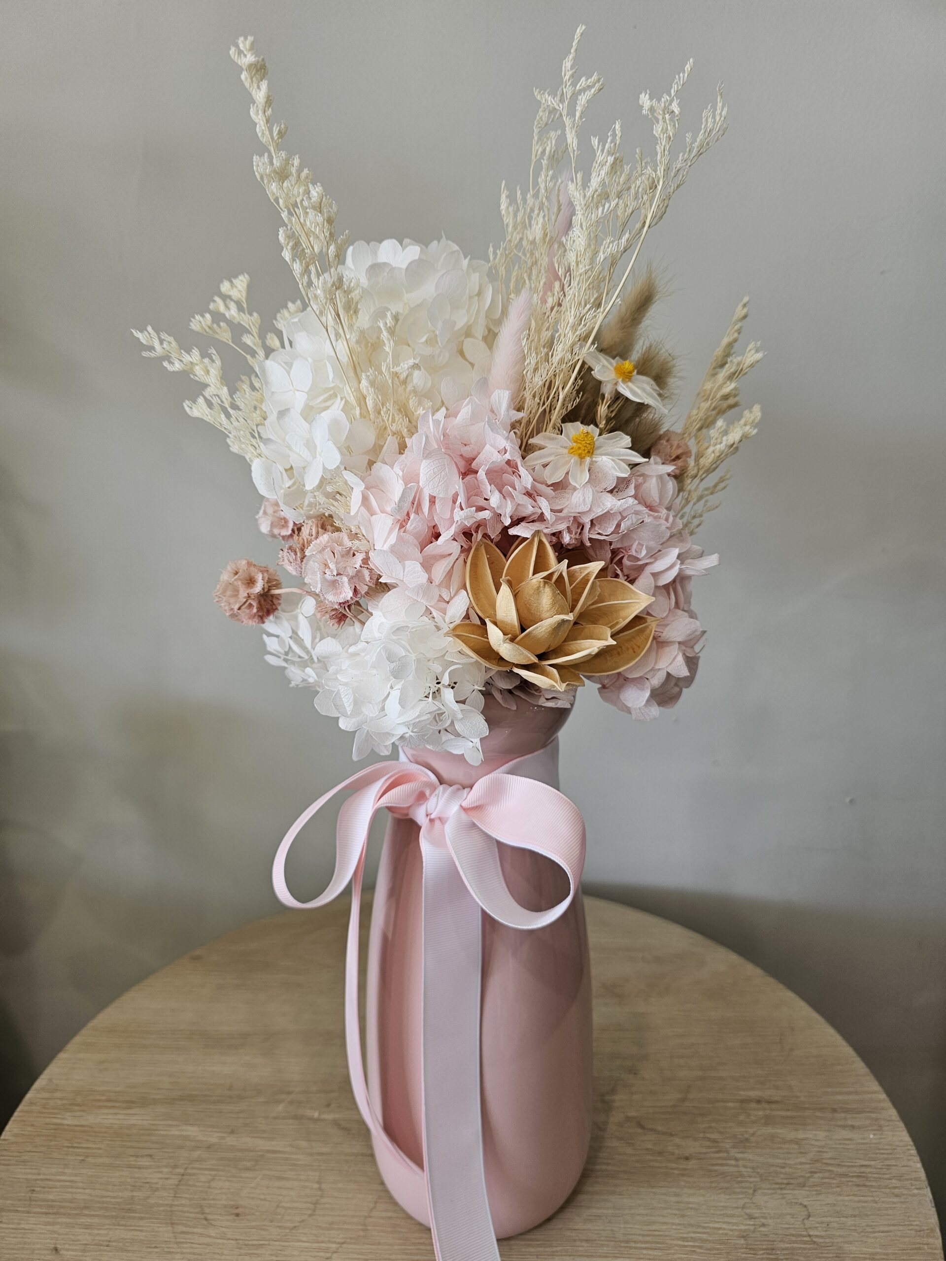 The Betty Preserved Flowers, an old soul of beauty, an everlasting arrangement of treated dried blooms. A large style arrangement in a beautiful white ceramic.