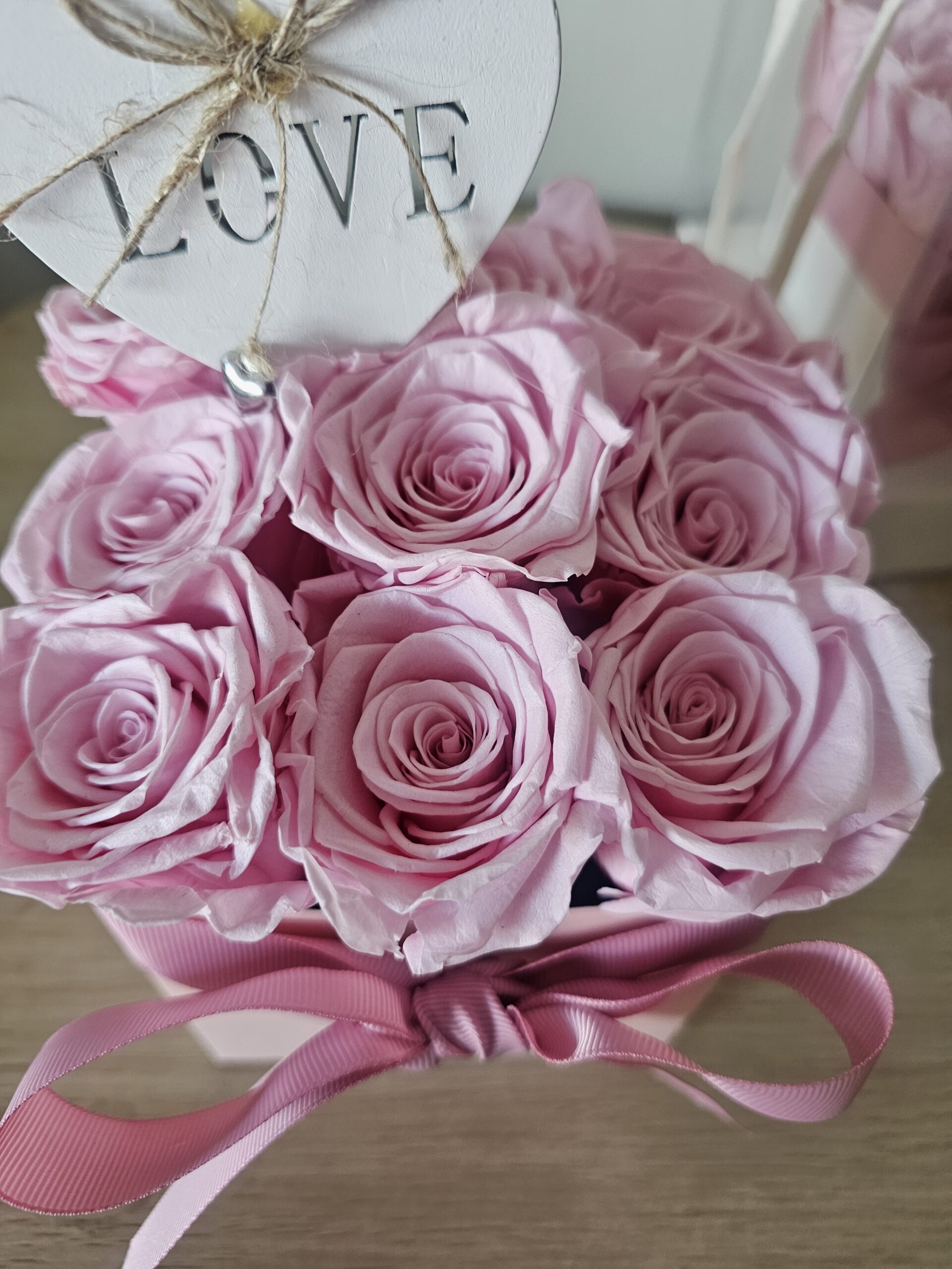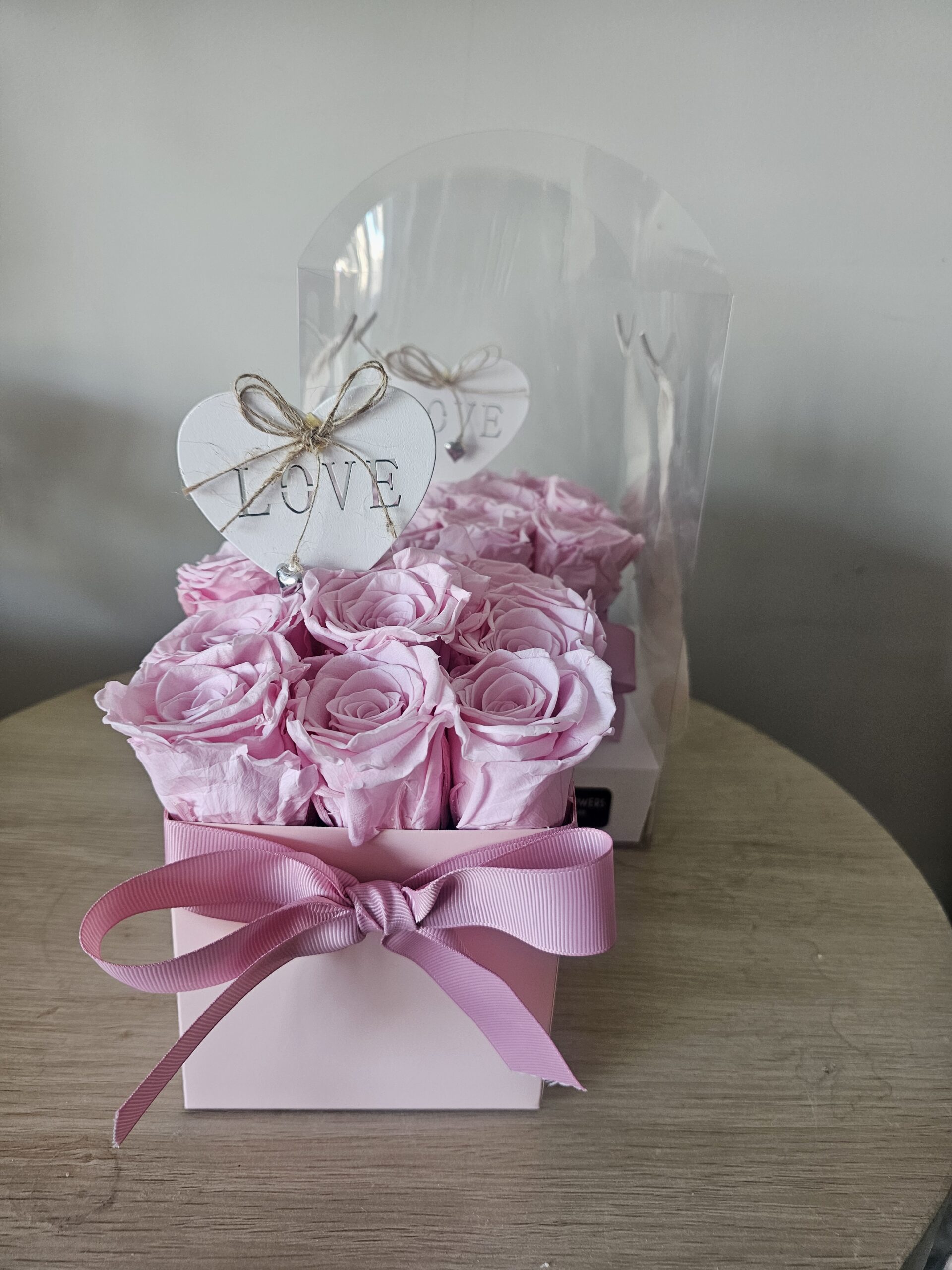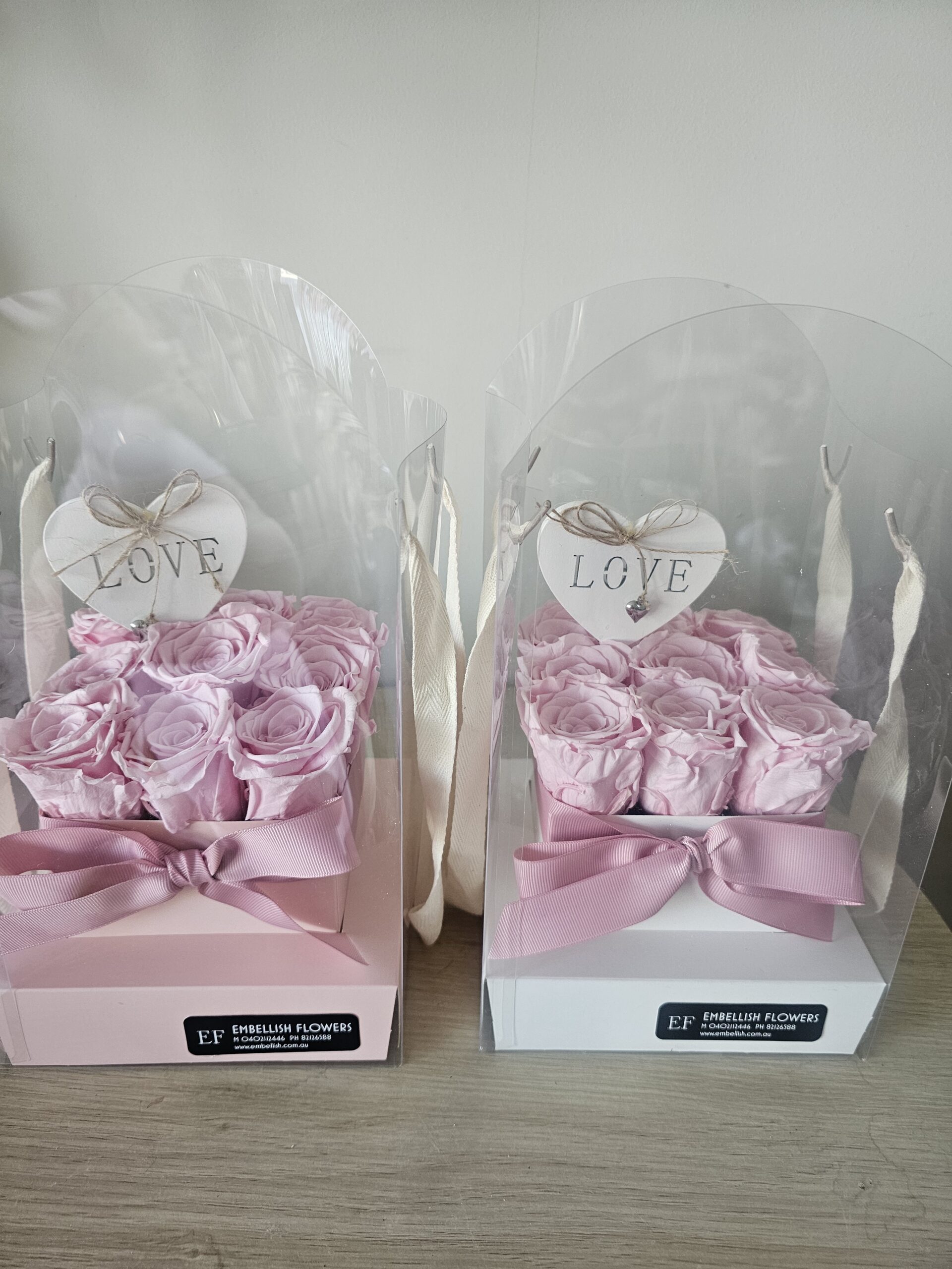 The Penelope preserved everlasting eternal roses, Say i love you forever!! Beautiful 9 pink or red preserved roses presented in beautifully presented carry box. These require no water and maintenance and will continue to look fresh and gorgeous.