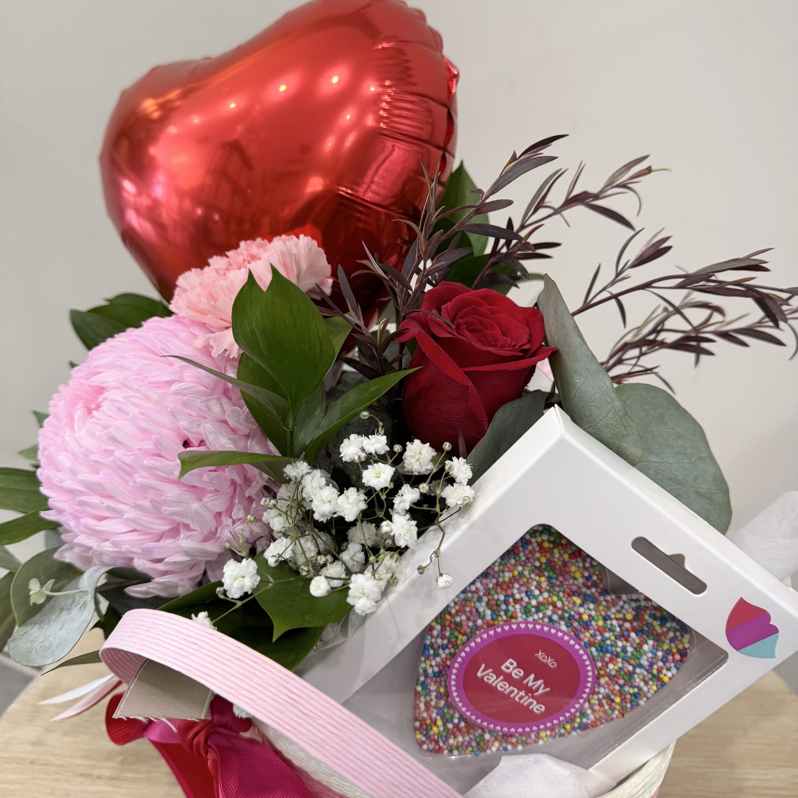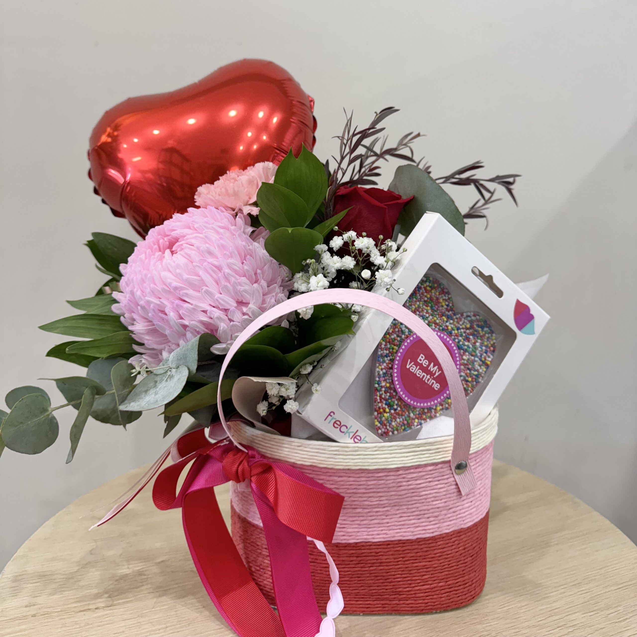The Evie is a sweet little hamper of pretty love!!! A freckleberry heart chocolate, an air filled love balloon and a gorgeous vase a sweet blooms in a pretty basket.