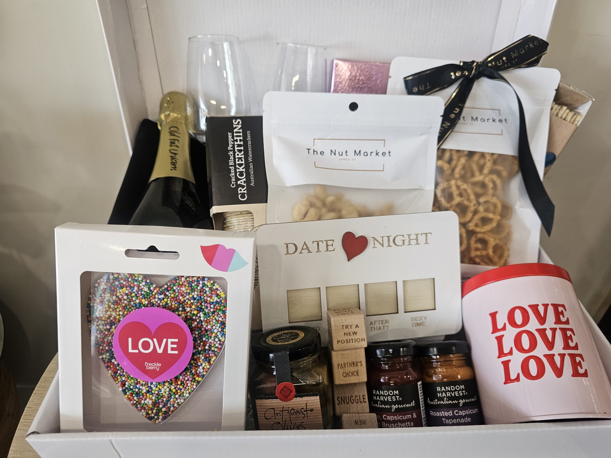 The Naughty night in savoury and sweet gift. Indeed a magnificent treat filled with a few my favourite things, Chocolates, biscuits, Nuts, popcorn, Crackers, and delicious sauces, This come with some cheeky bubbles and champagne glassses, a sweet smelling romance candle and a naughty little roll the dice game!!