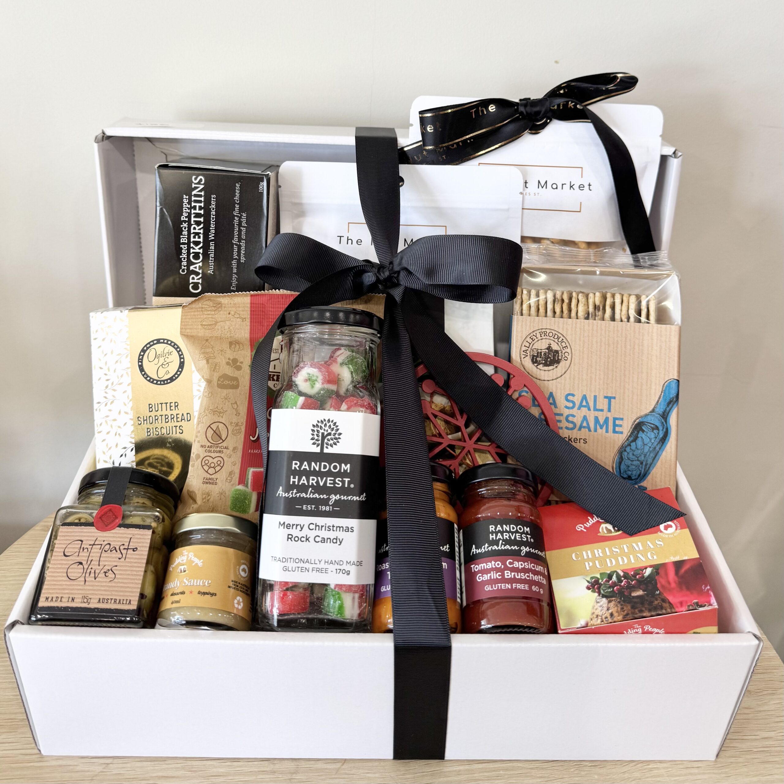 Mrs Claus goodies of yummy sweet and savory treats.wrapped in a lovley hamper style with all the christmas trimmings. Shortbread, candies, pudding, caramel fudge sauce and crackers.