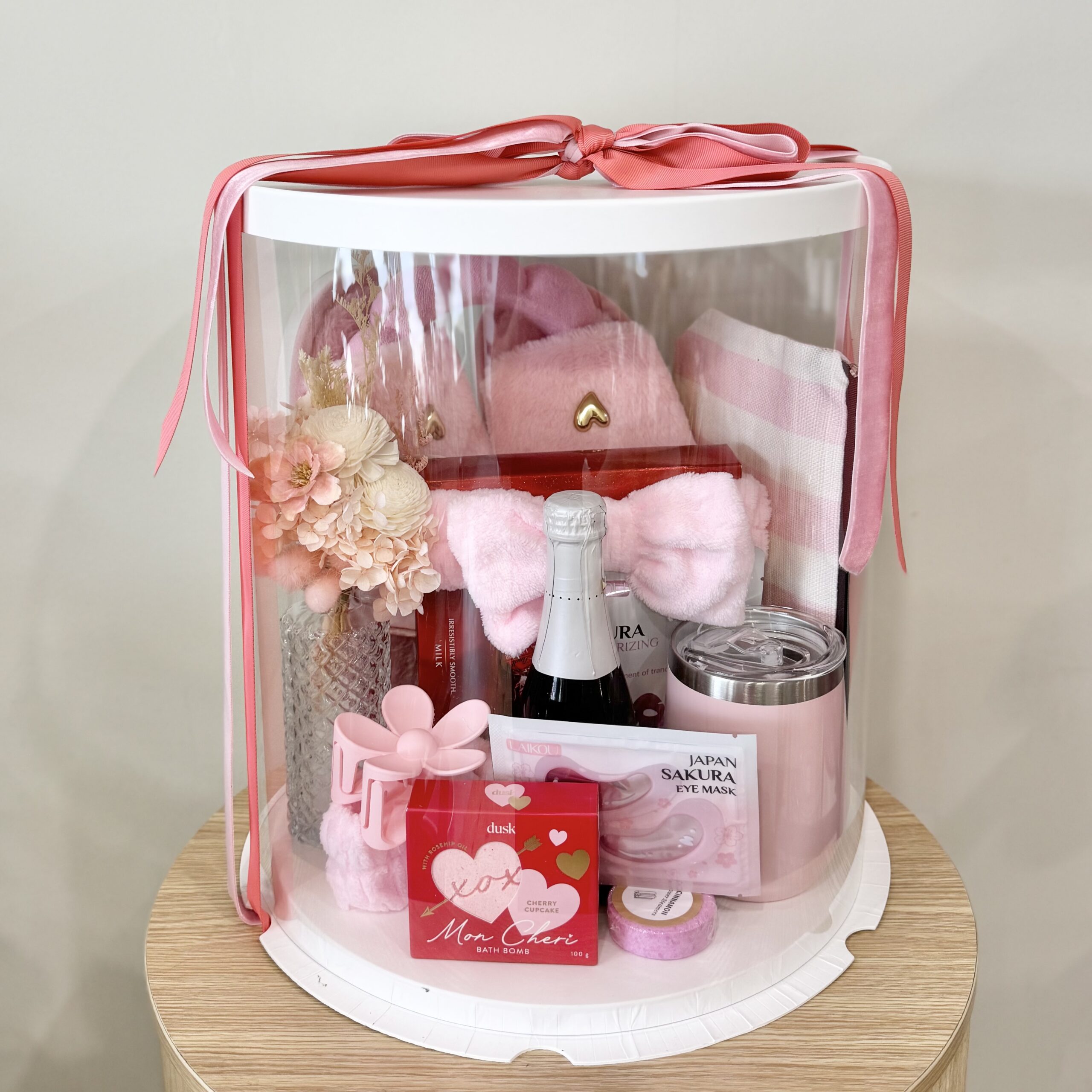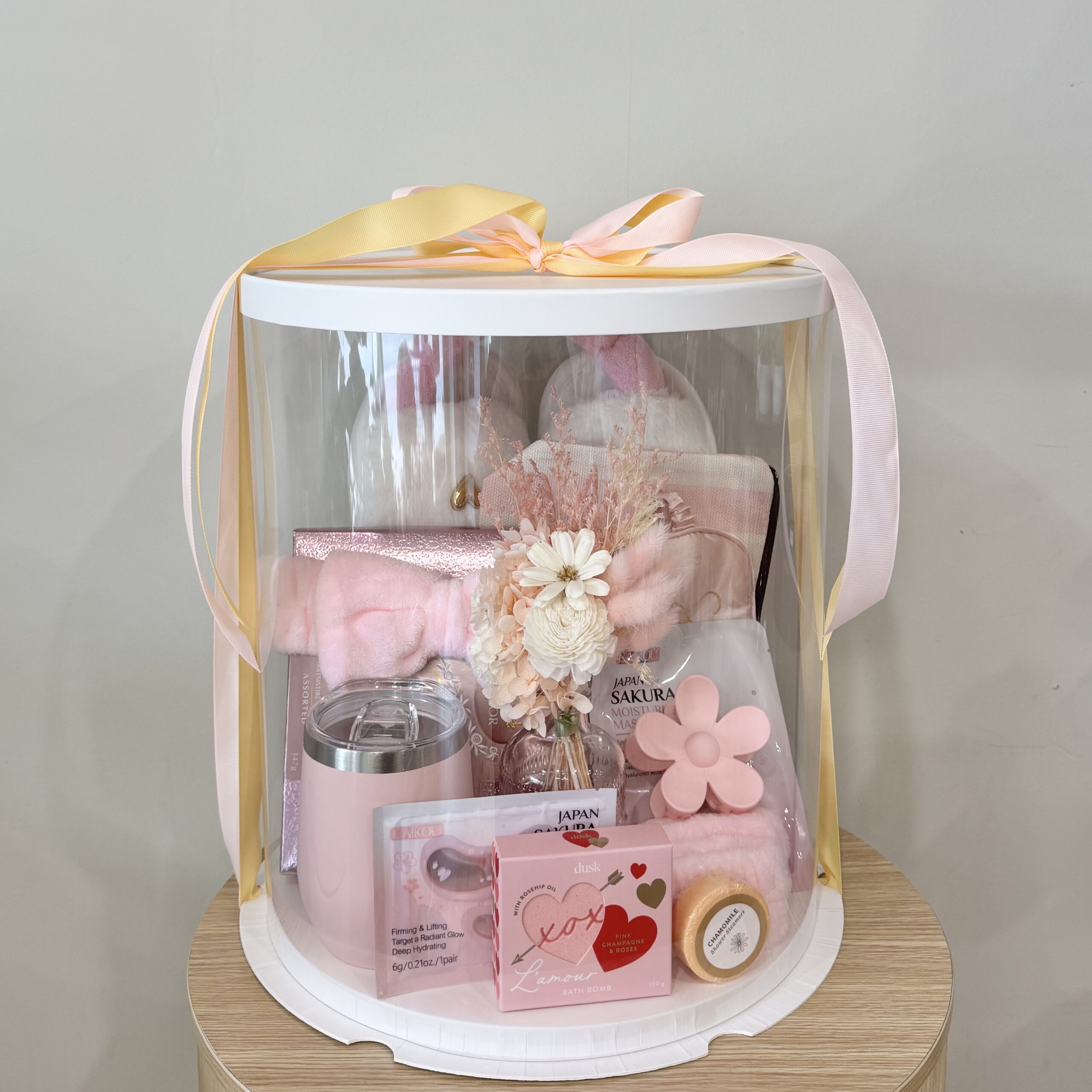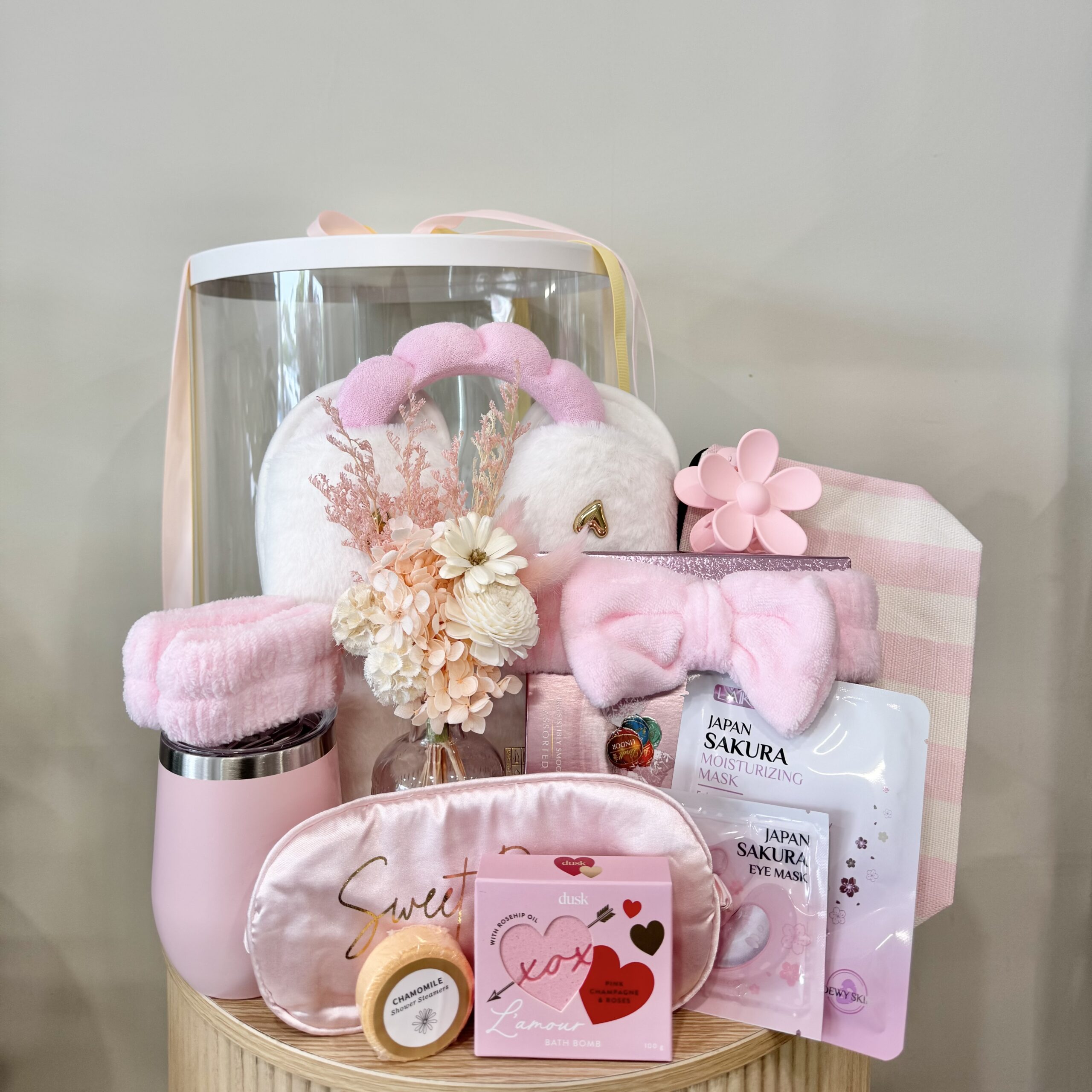 The Pamper hamper is a pretty perfect gift for the new mum, a lady going through a tough time, a birthday treat, a sympathy pick me up or a just because she needs it!! filled with face and eyes masks, a bath bomb, shower fizzer, silk eye mask, beauty hair accessories, make up bag, slippers, a travel mug, choccies – lindt 150g, and a gorgeous preserved flower arrangement. JUST DREAMY!!! Thiss is packaged so perfectly and is a definate winner.