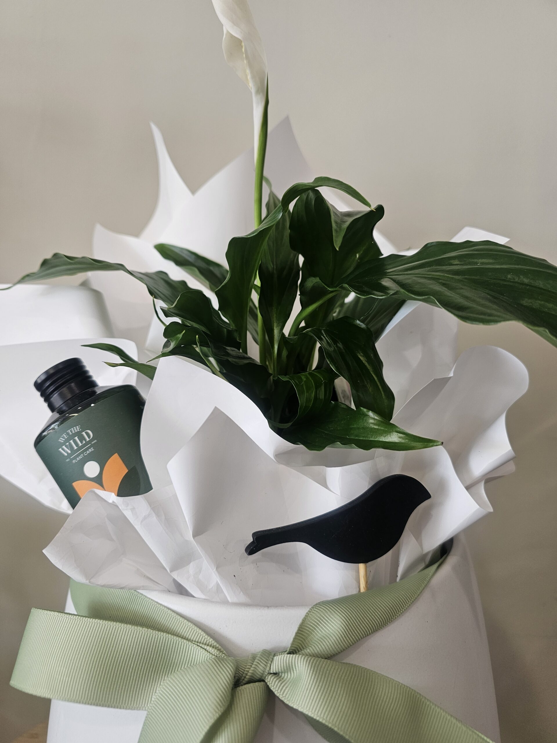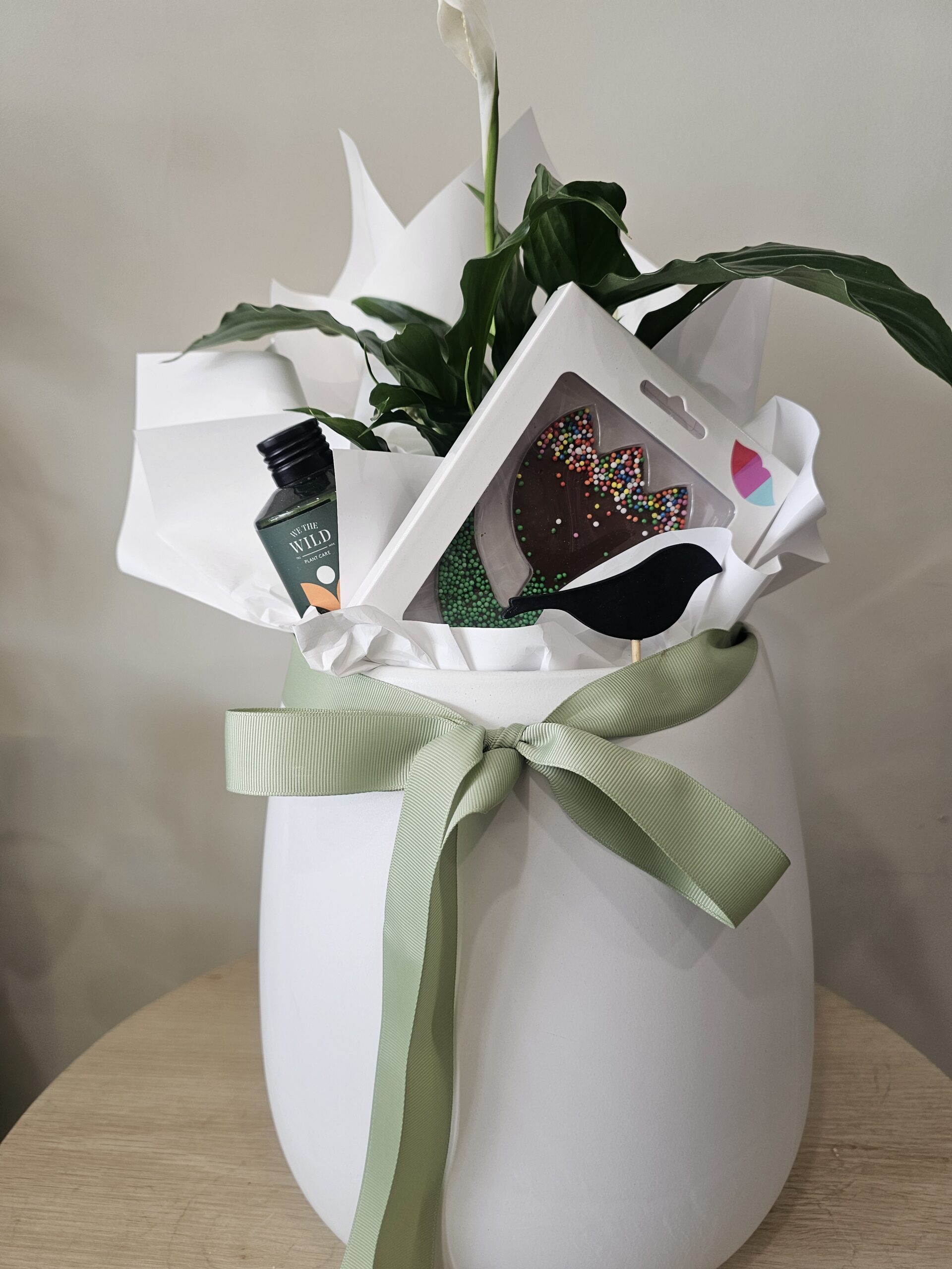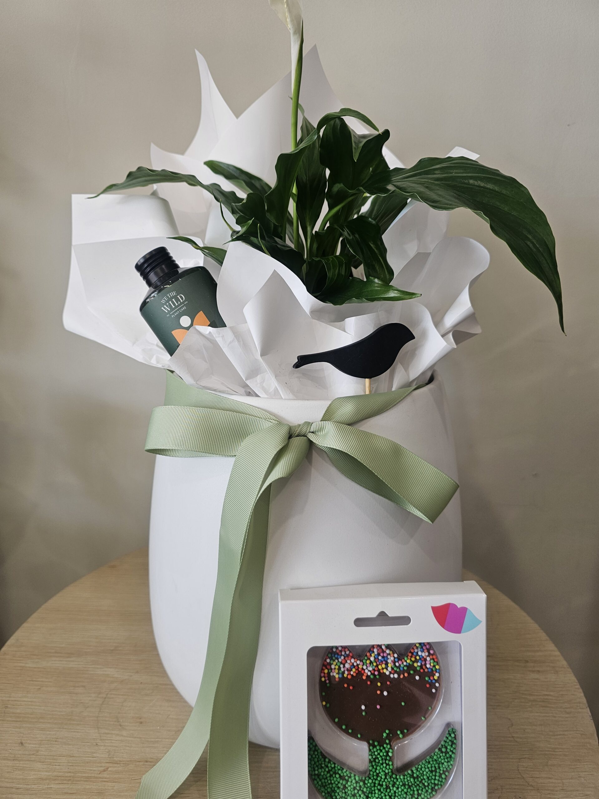 The Birdie plant hamper is filled stunning peace lilly plant with a we the wild plant food to protect its beauty and a delicious freckleberry chocolate. It comes in a white ceramic pot all wrapped and ready to gift.