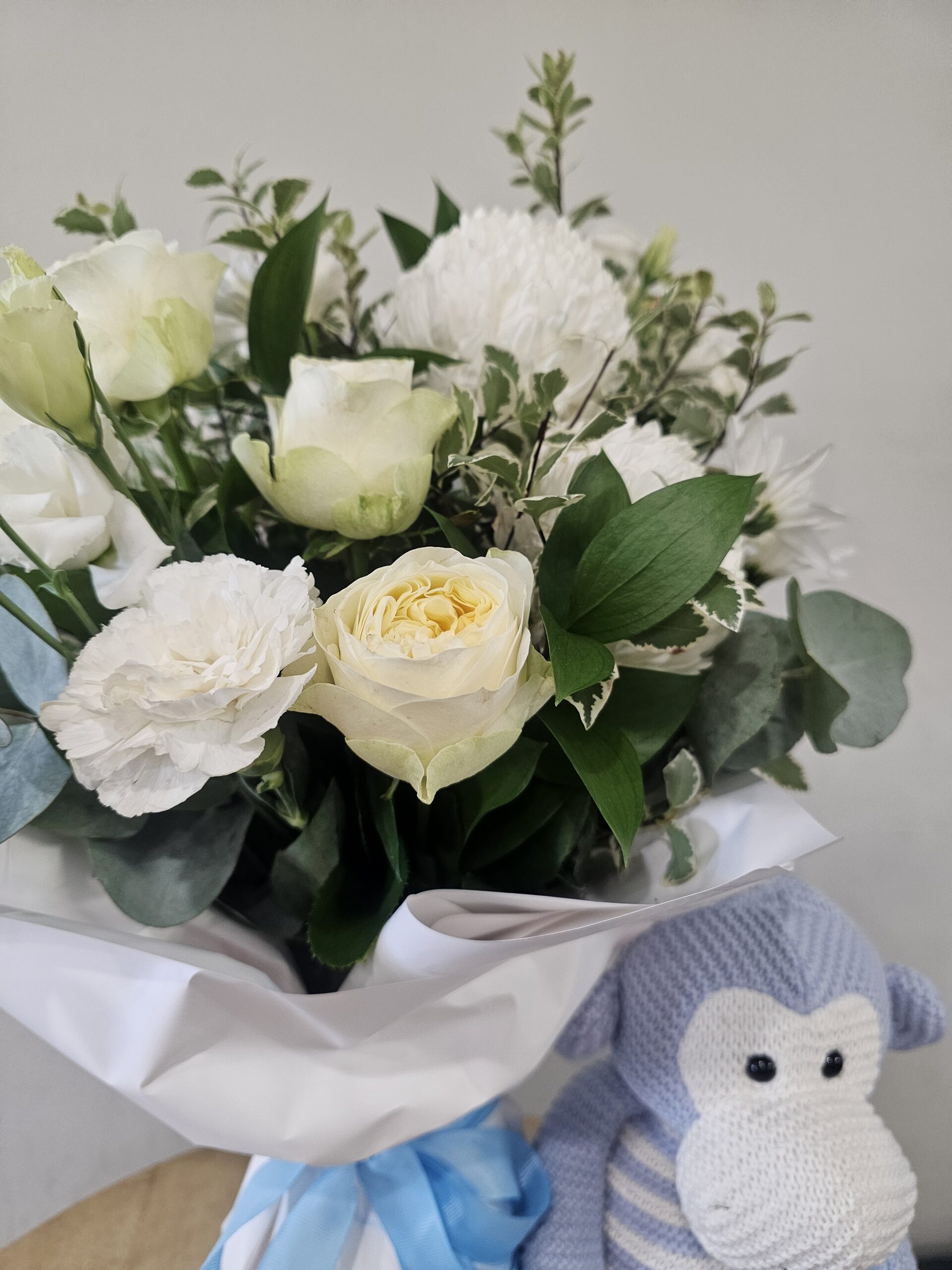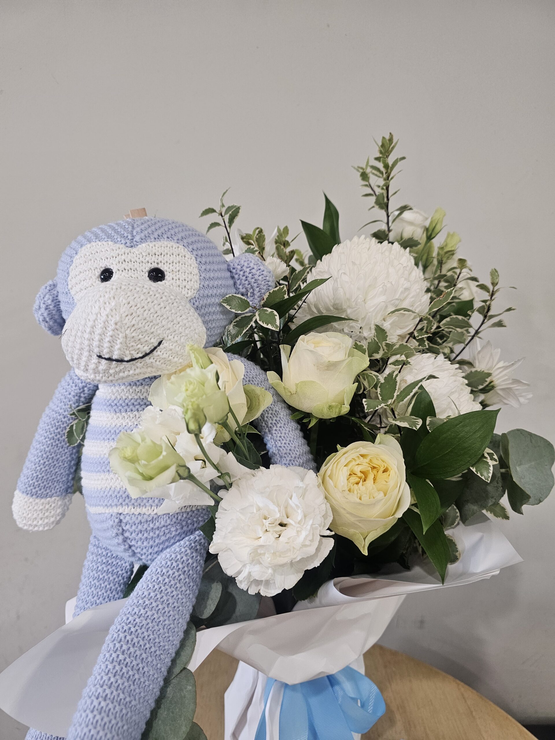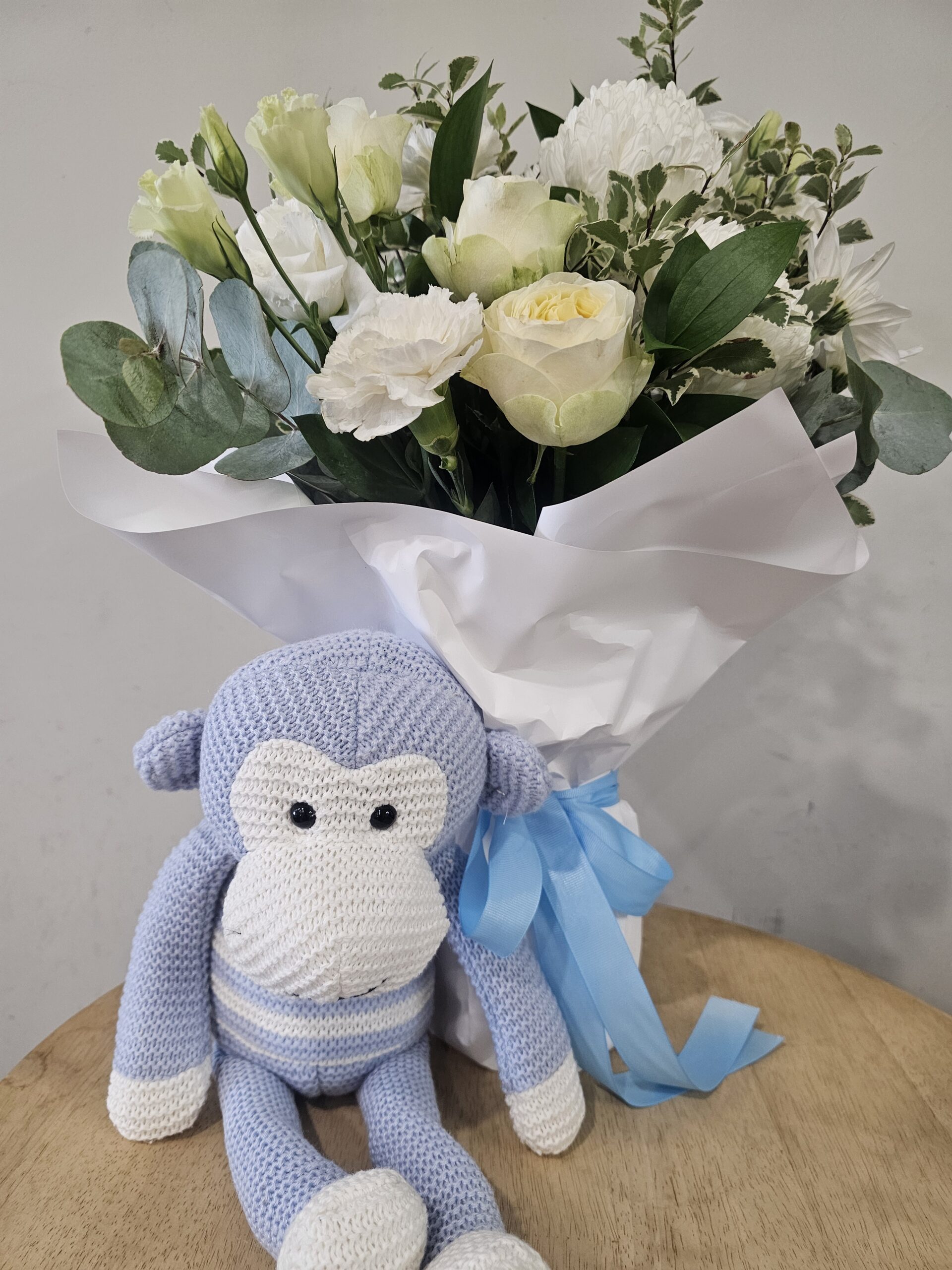 The Henry new baby, these flowers will warm your heart. A beautiful woollen monkey will become his best friend to do monkey business with!! This comes displayed in a glass vase gift wrapped with gorgeous seasonal flowers. This will certainly welcome the arrival of your sweet little man.